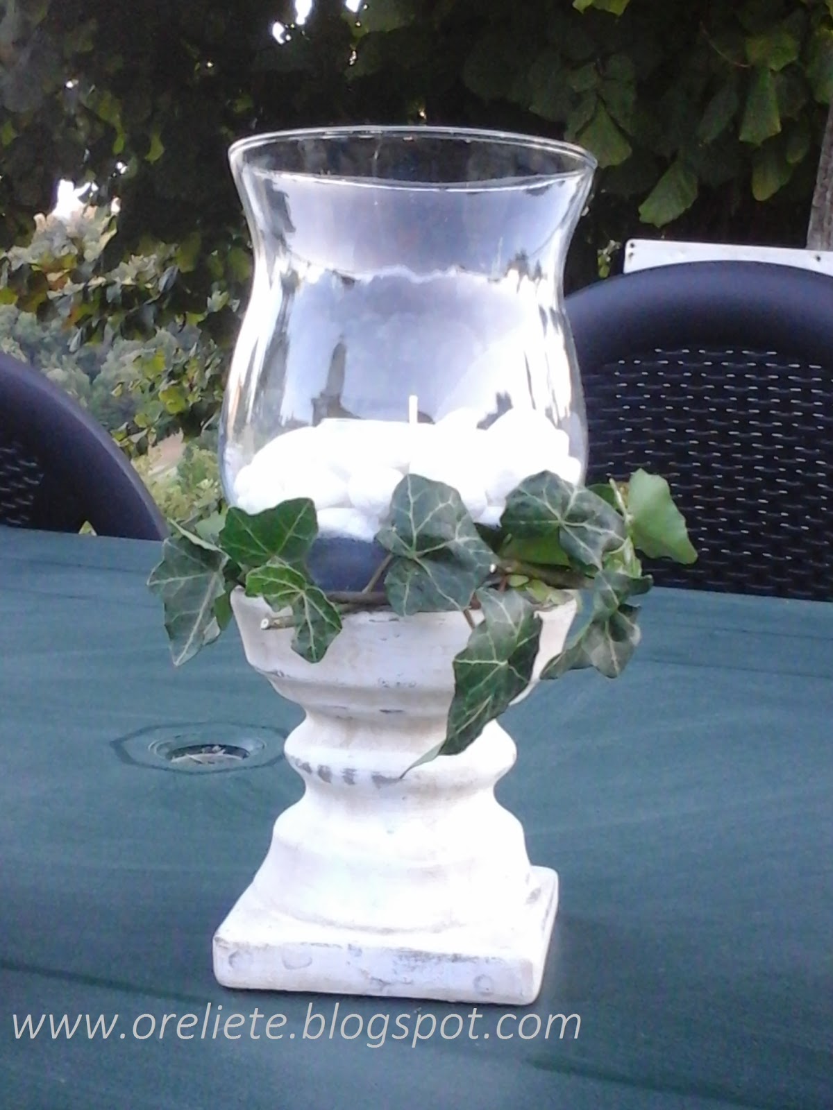Queste piccoline mi sono divertita a farle sul momento, riciclando i vasetti piccoli della Bormioli, sabbia colorata sassi bianchi ed edera raccolta sul posto, infine in cima delle candeline.